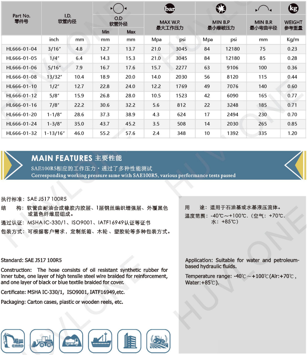 SAE J517100R5單層鋼絲編織層、織物外覆層的液壓軟管
