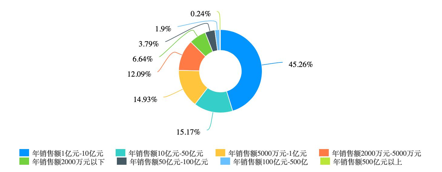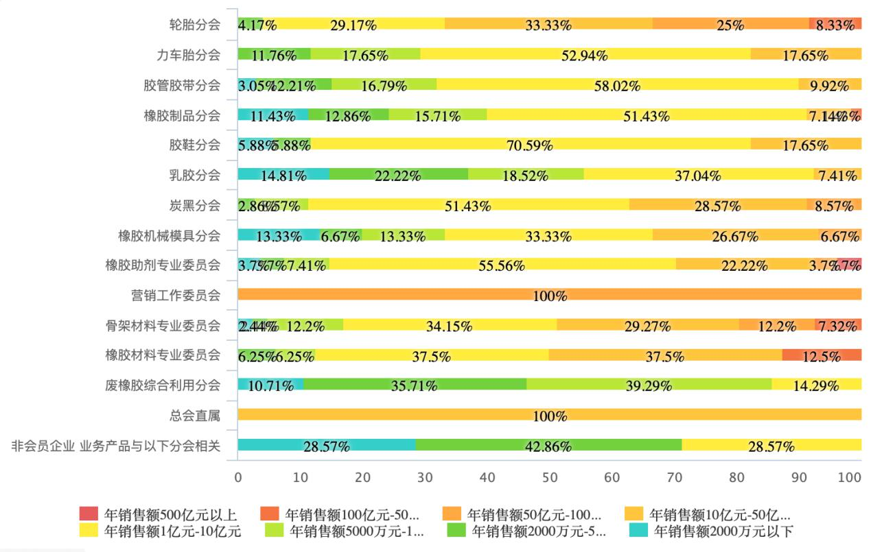 根據分會及專委會細分行業不同,企業經營規模有差異,橡膠行業 422 家參與調研答卷的企業中,45.26%的企業年銷售額在 1億-10 億元區間內;15.17%的企業年銷售額在 10 億-50 億元區間內;14.93%的 企業年銷售額在 5000 萬-1 億元區間內,其余如圖 3 所示。