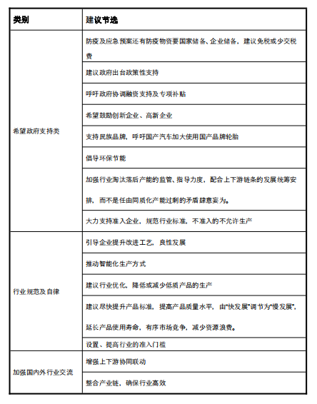 期望政策方面:取消天然橡膠進口關稅、降低制造業稅收、解決物流運輸通道受限的情況、政府機構因疫情影響延遲交貨的違約責任劃清、減少行政類管控等;