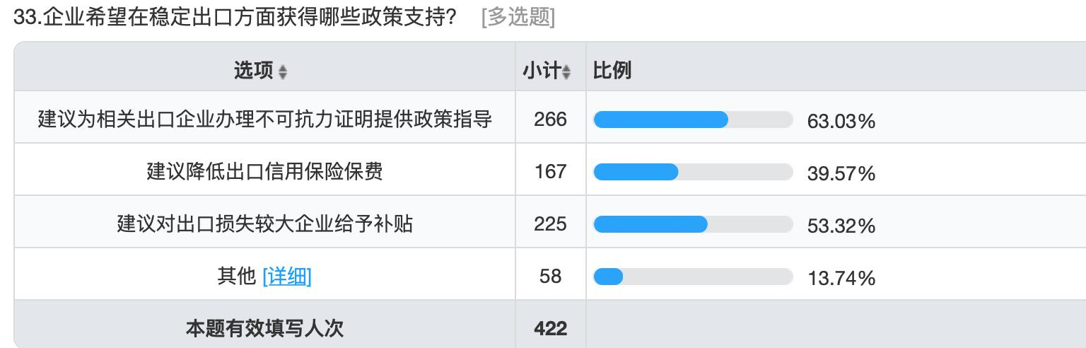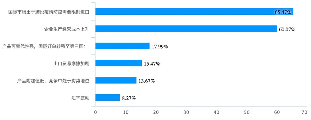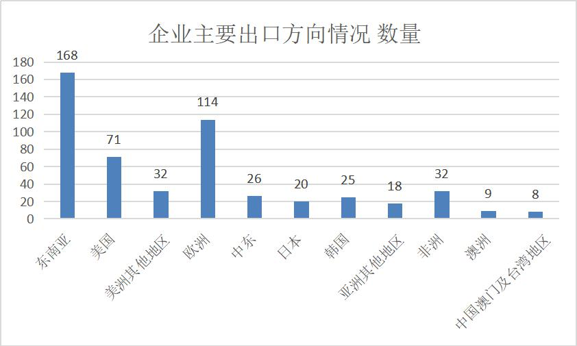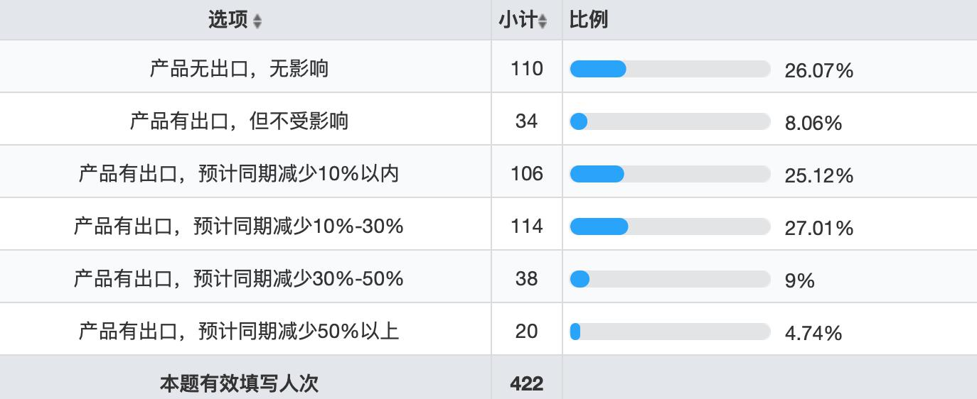 422 份問卷中,約 110 家企業無出口,占比為 26.07%,主要銷往國內市場;其余 312 家參與答卷的企業有出口業務,其中有 34 家企業或因產品不可替代、或因海外有工廠,迅速調整了布局、或因工廠靠近港口出貨便利等原因,出口沒有受到影響,其余企業均有著不