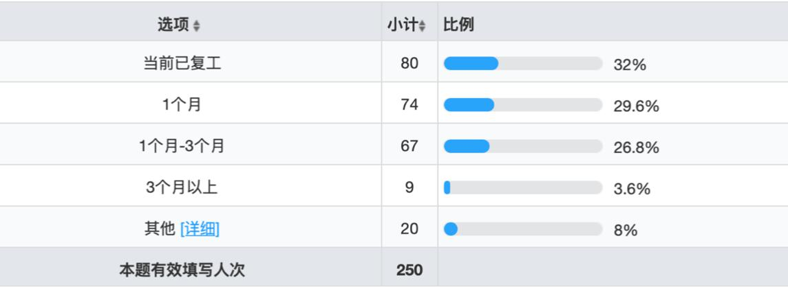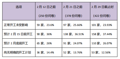 企業承受期限調查項中,按照填報時間進度,當時時點的復工率 由 2 月 12 日填報 250 份問卷時的 32%,到十日后填報 378 份問卷 時上升到 38.62%,到 2 月底復工率達到填報總數 40.28%,反映了 橡膠行業企業自強不息,逐漸努力恢復生產經營。