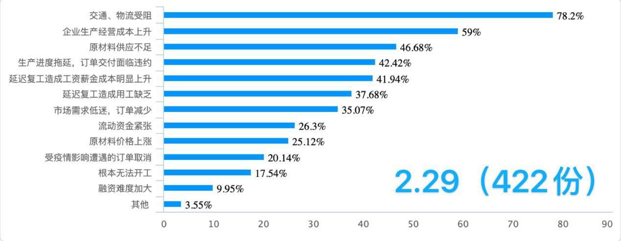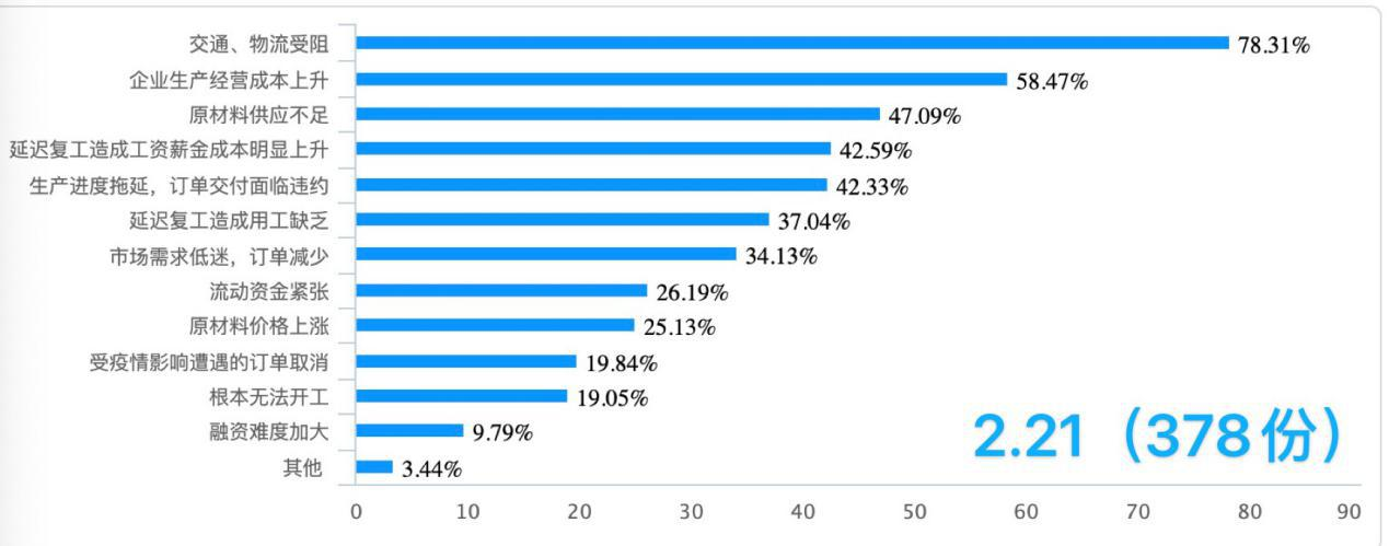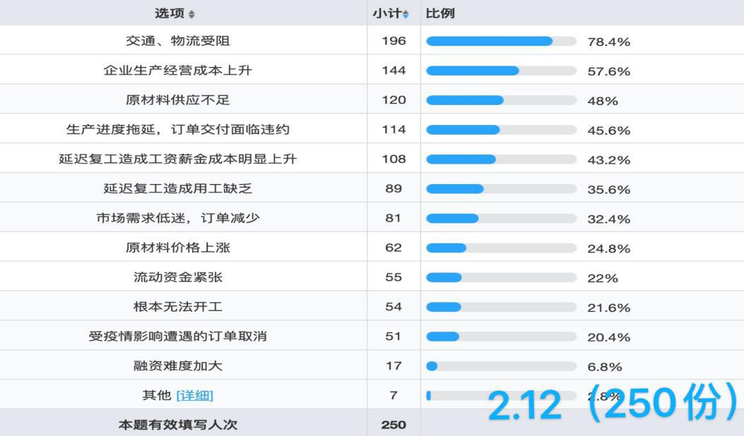 “這一突出棘手的問題,也由 2 月 12 日占比 78.4%的企業反饋,到十日后 2 月 21 日占比降為 78.31%,到問卷截止時,這一占比為78.2%。從這組數據上可以看出:隨著有序復工的推進,國家和地方在交通運輸、物流上出臺了相應的政策支撐,使交通、物流受阻得以