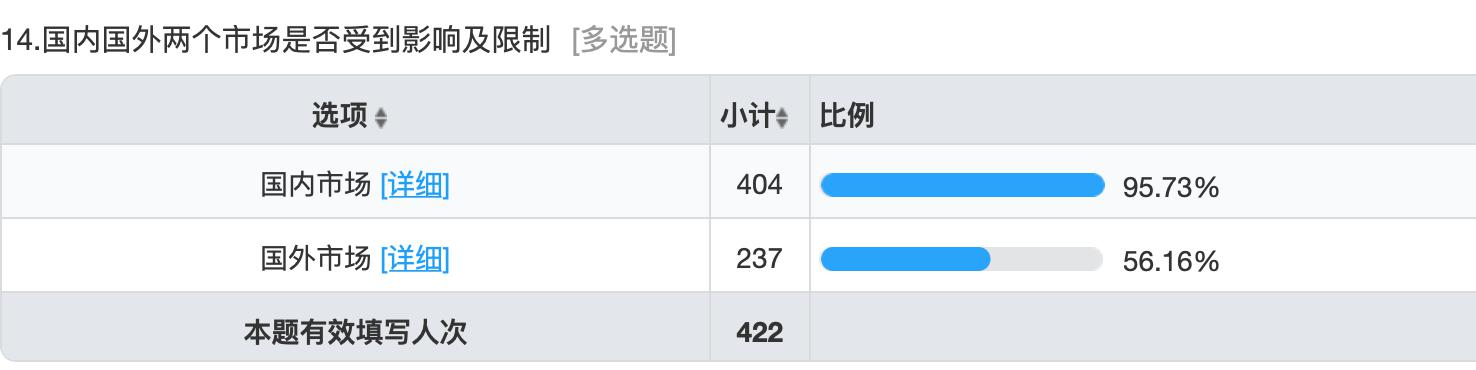 422 份問卷中,404 份認為國內市場受到了嚴重的影響,占比為95.73%(2 月 12 日時,250 份問卷中有 238 家企業認為國內市場受嚴重的影響,當時的占比為 95.2%,隨著時間的推移,很多企業也在逐漸恢復生產,努力減少疫情帶給企業的損失,但國內市場仍有災難性的影響。),同時有 237 份問卷,占比為 56.16%的企業也認為國外市場也受到到了不同程度的影響。