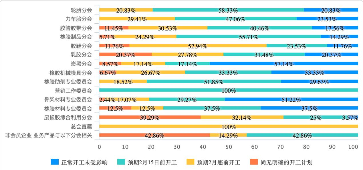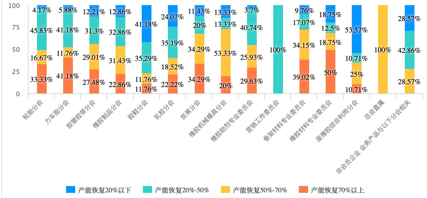 另外,從下圖 7 我們可以看出按照橡膠行業各細分行業看,我們的各分會及專委會會員的 2 月底前的產能恢復情況,產能情況恢復較好的有橡膠材料企業、骨架材料鋼簾線行業、炭黑行業等,需要說明的是受限于各分會及專委會的填報數量不同,企業類型不同,所以此項情況僅供參考。