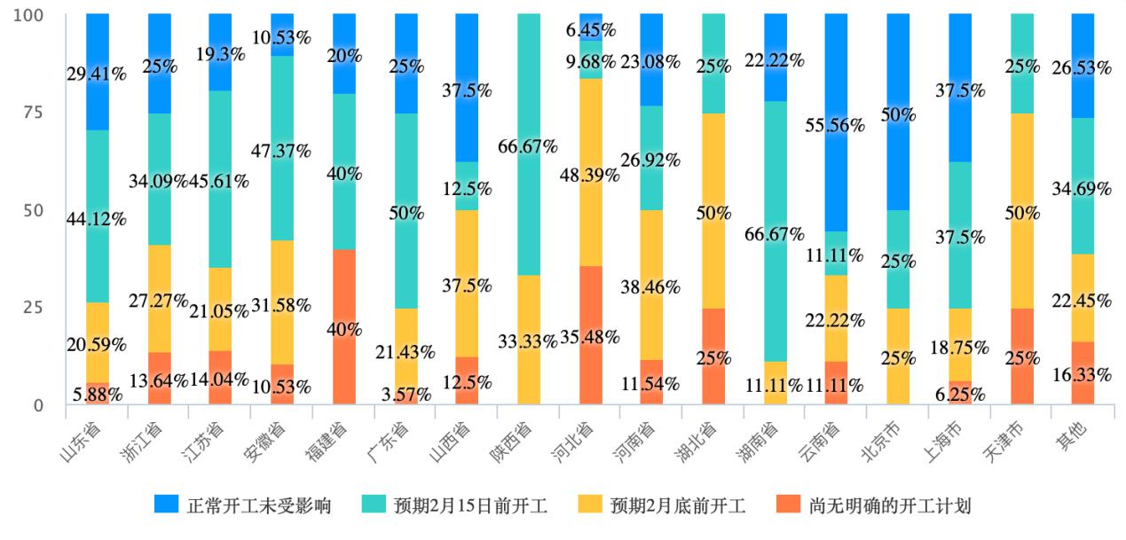 另外,可以從下圖 6 中看出各省市的開工情況,受影響比較大的省份和地區有湖北、福建、河北、天津等。