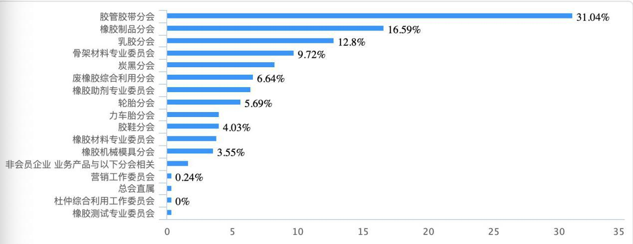 422 份問卷填報企業中,131 家來自膠管膠帶分會,占比為 31.04%;70 家來自橡膠制品分會,占比為 16.59%;54 家來自乳膠 分會,占比為 12.8%;骨架專委會分會有 41 家,占比 9.72%;炭黑 分會和廢橡膠綜合利用分會分別為 35 家和 28 家,占比分別為 8.29% 和 6.64%;橡膠助劑專委會有 27 家企業填報,占比為 6.4%;輪胎 分會有 24 家填報,占比 5.69%;力車胎分會、膠鞋分會均有 17 家 企業填報,占比 4.03%;橡膠材料專委會有 16 家企業,占比 3.79%; 橡膠機械模具分會 15 家企業填報,占比 3.55%。見下圖 1。