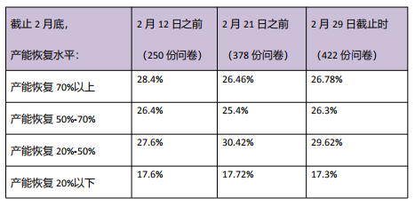 從企業階段性填報的過程中可以看出,隨著時間的推移,抗疫進程的推進,2 月底企業產能的恢復水平的占比數有被修正,其中產能能恢復約 70%以上,2 月 12 日第一次小結中 250 份問卷時這個占比為28.4%,約十天之后這個數字下降到 26.46%,截止 2 月底填報問卷結束,有 26.78%的企業認為產能可以恢復在 70%左右。產能恢復50%-70%,經過中間波動,數值基本穩定在 26.3%;產能恢復20%-50%這一情況由最初的排名第二,到最后變成了占比最多的一項,為 29.62%,大多數企業的產能釋放還是受到了很大的影響;產能只能恢復 20%及以下為受災比較嚴重的一批企業,占比也有 17%左右,詳見下表 2。