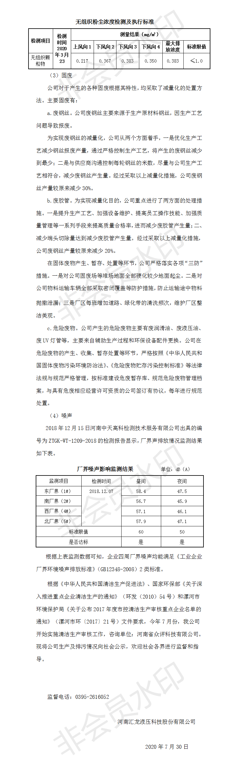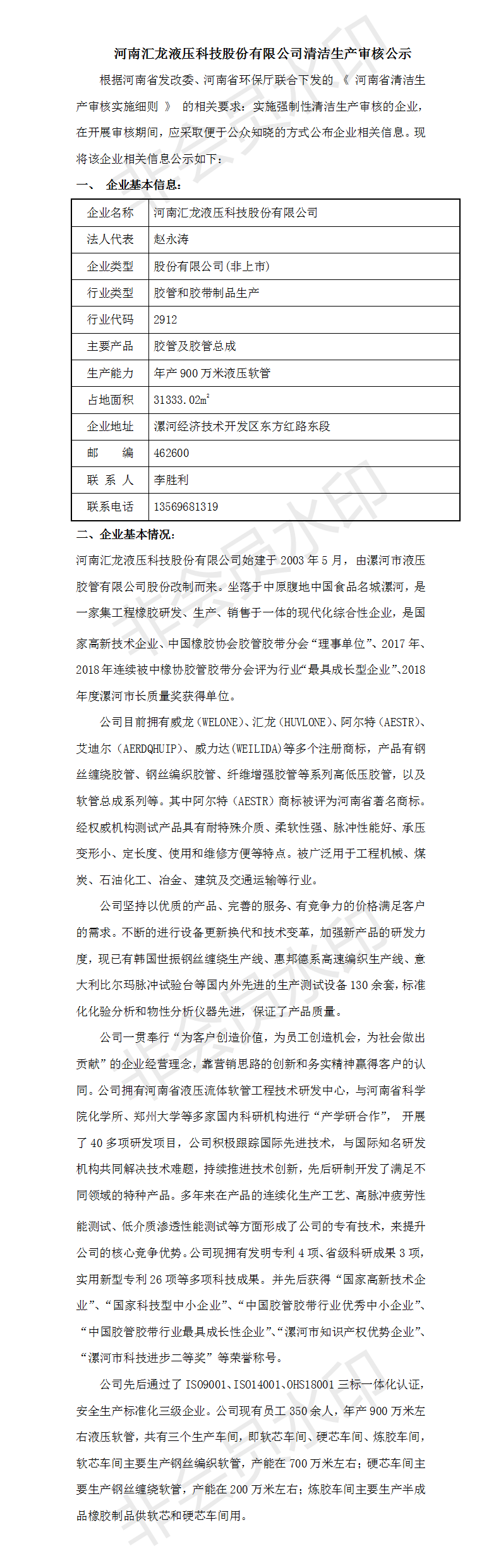 河南匯龍液壓科技股份有限公司清潔生產審核公示
